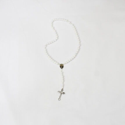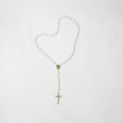 Terço de Imaculado Coração de Maria Branco Especificações: Conta: 8mm Medalha: 1,8cm altura x 1,3cm largura Crucifixo: 3,5cm altura x 2,5cm